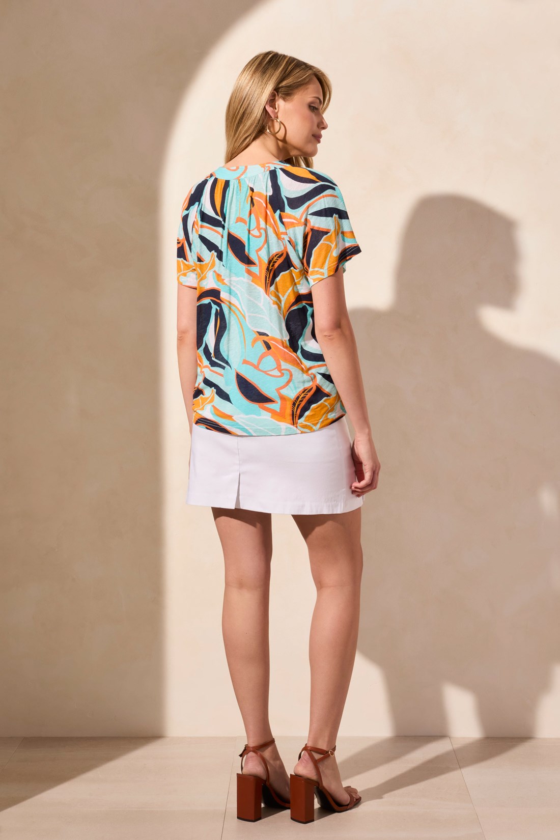 Bring a carefree, breezy element to your style with this flowy henley top, defined by a playfully bright and bold print. The linen-blend knit keeps it breathable, while fluttering raglan short sleeves provide a refreshed feel on warmer days. The contour neckband adds flattering structure, and multi-stitched details speak to the high-quality construction.