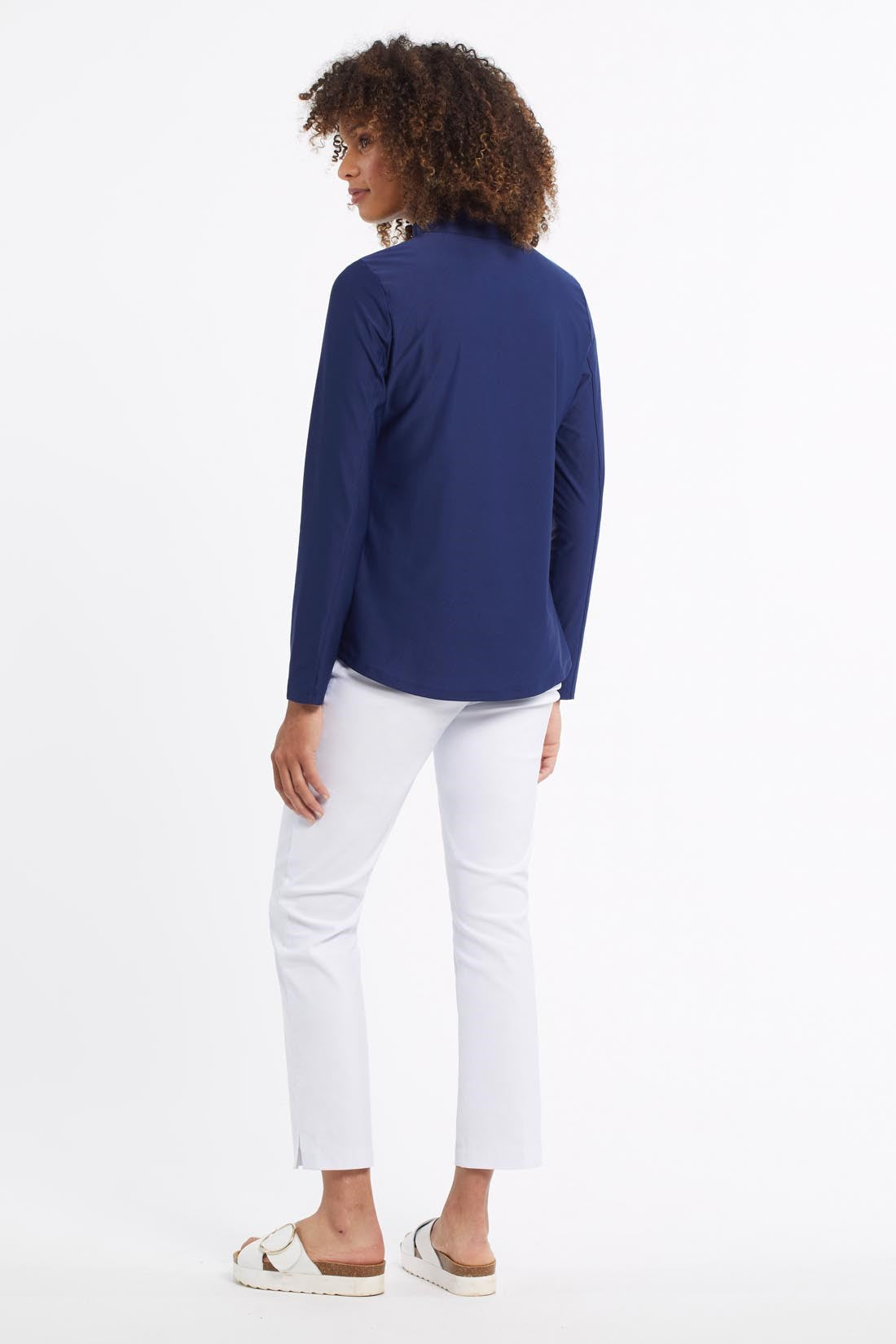 This long sleeve mock top is the perfect addition to any activewear collection. Made with our new upgraded moisture-wicking fabric, it's light weight and has antibacterial properties as well as UPF 50+ protection. This top will keep you comfortable and looking great anywhere from the golf course to the tennis court to even a day on the water.